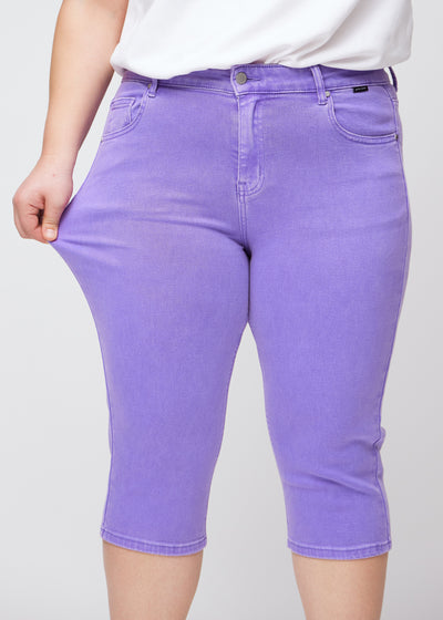 Lilla slim capris i farven Lavenders – set fra siden på en plus-size model.